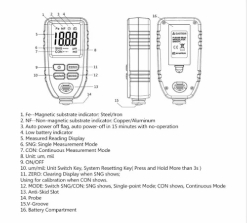 - 1.Fe-Magnetic substrate indicator: Steel/Iron ,NF–Non- Magnetic substrate indicator: Copper/Aluminum